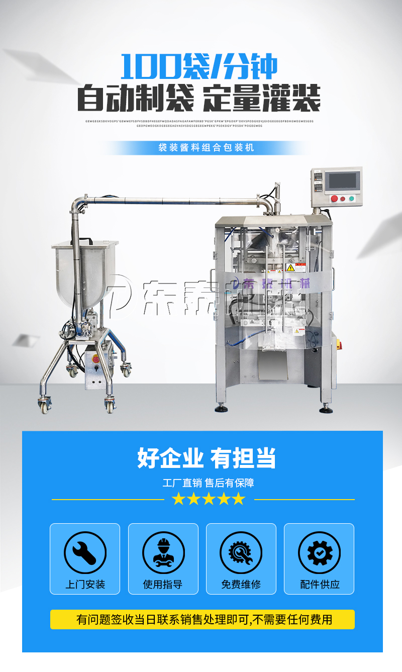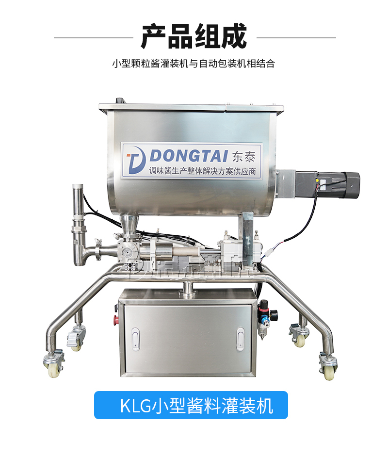 本機(jī)器主要用于調(diào)味品醬料的自動(dòng)化包裝,機(jī)器安裝有橫向螺帶式攪拌,使油醬混合均勻,確保灌裝精度和產(chǎn)品包裝成品的均勻性。灌裝計(jì)量設(shè)備安裝有萬(wàn)向輪,管路鏈接均采用快拆接頭,方便灌裝機(jī)拆卸移動(dòng)清洗。包裝設(shè)備采用全伺服驅(qū)動(dòng)器,包裝速度快,運(yùn)行穩(wěn)定。