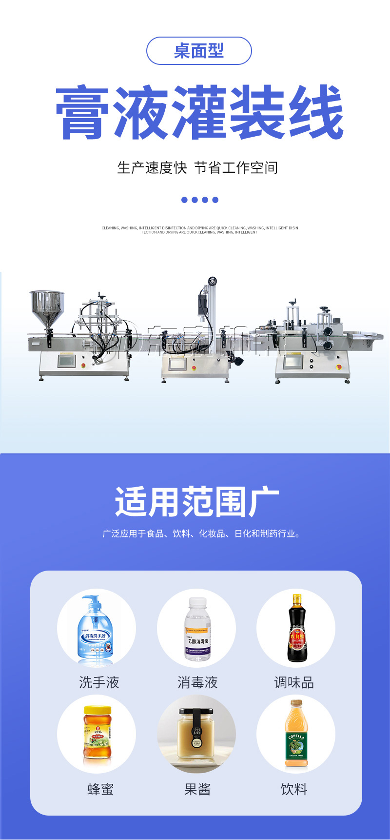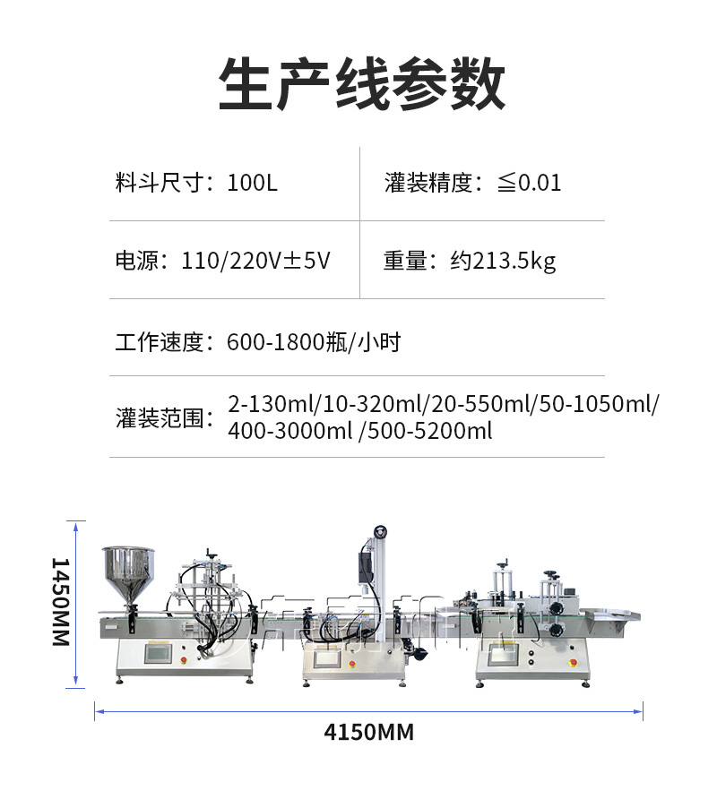 產(chǎn)品說明:生產(chǎn)線根據(jù)灌裝范圍選擇型號,灌裝部分為雙頭下潛式灌裝機,適用于不同物料不同瓶子的灌裝,配備自動壓蓋機和圓瓶貼標機,可實現(xiàn)不同蓋子的旋蓋貼標工作。 本設備主要適用于食品、日;