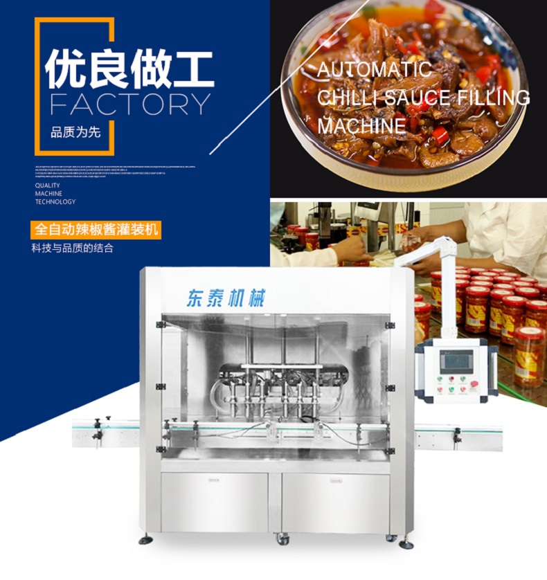 產(chǎn)品簡介 全自動辣椒醬類醬體灌裝生產(chǎn)線作為公司新研發(fā)的灌裝設(shè)備在市場上起到了關(guān)鍵性的作用,獨特的技術(shù)讓整個包裝市場變得富有生命力,是集光,機,電,氣于一體,采用活塞式定量原理,灌裝精度高,操作簡單,