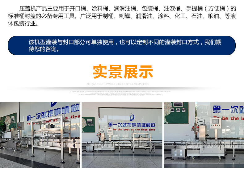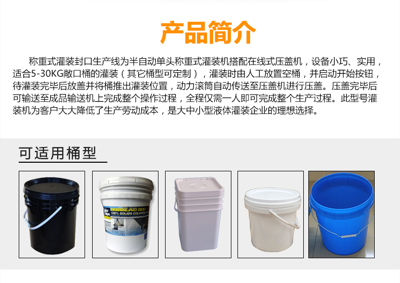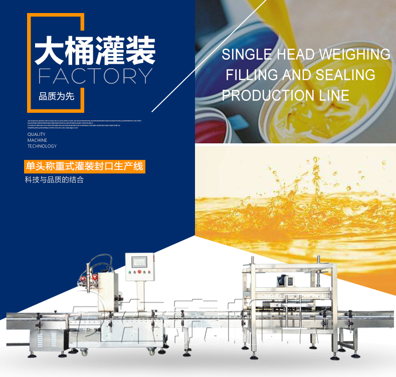 稱重式灌裝封口生產(chǎn)線為半自動(dòng)單頭稱重式灌裝機(jī)搭配在線式壓蓋機(jī),設(shè)備小巧、實(shí)用適合5-30KG敞口桶的灌裝(其它桶型可定制),灌裝時(shí)由人工放置空桶,并啟動(dòng)開始按鈕,待灌裝完畢后放蓋并將桶推岀灌裝位置,動(dòng)力滾筒自動(dòng)傳送至壓蓋杋進(jìn)行壓蓋。壓蓋完畢后可輸送至成品輸送機(jī)上完成整個(gè)操作過程,全程僅需一人即可完成整個(gè)生產(chǎn)過程。此型號(hào)灌裝機(jī)為客戶大大降低了生產(chǎn)勞動(dòng)成本,是大中小型液體灌裝企業(yè)的理想選擇。