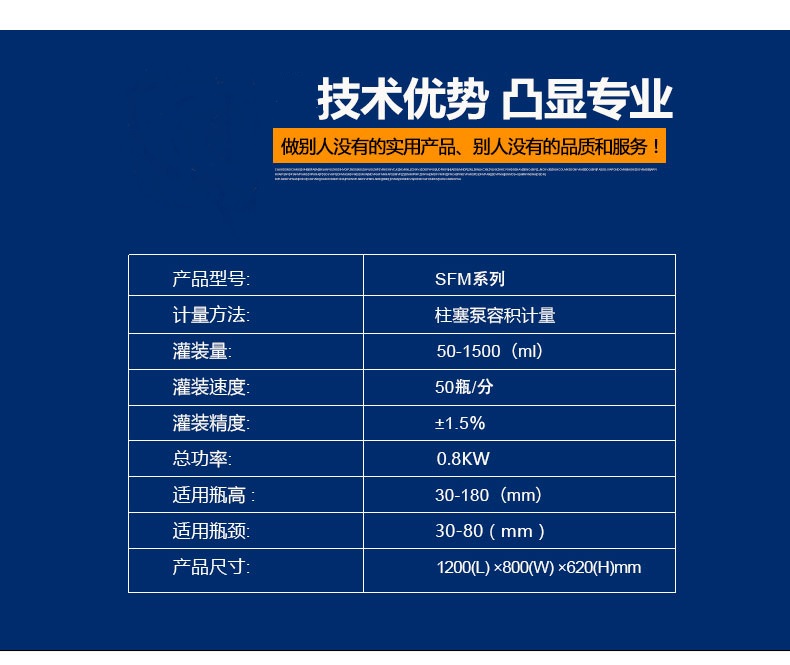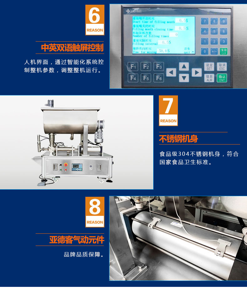 產(chǎn)品簡(jiǎn)介:半自動(dòng)醬類(lèi)醬料灌裝機(jī)SFM系列結(jié)構(gòu)合理、機(jī)型小巧、性能可靠、定量準(zhǔn)確、操作方便。整機(jī)304不銹鋼,灌裝悶頭防漏料防滴油,氣缸驅(qū)動(dòng)結(jié)構(gòu),加大200L料斗,品牌全鋁殼銅芯大功率攪拌電機(jī),變頻調(diào)速,PLC智能控制,用戶可根據(jù)需要任意調(diào)節(jié)灌裝量及灌裝速度,灌裝精度高。