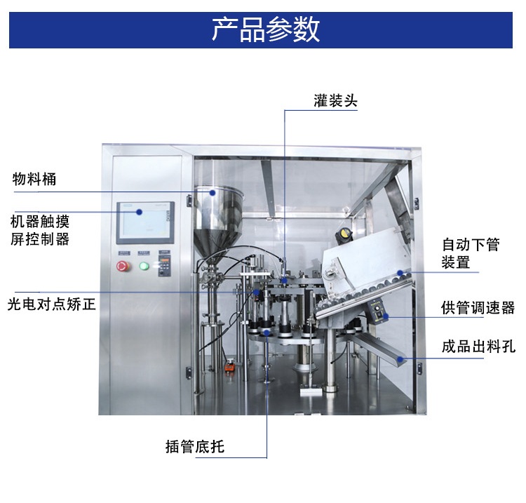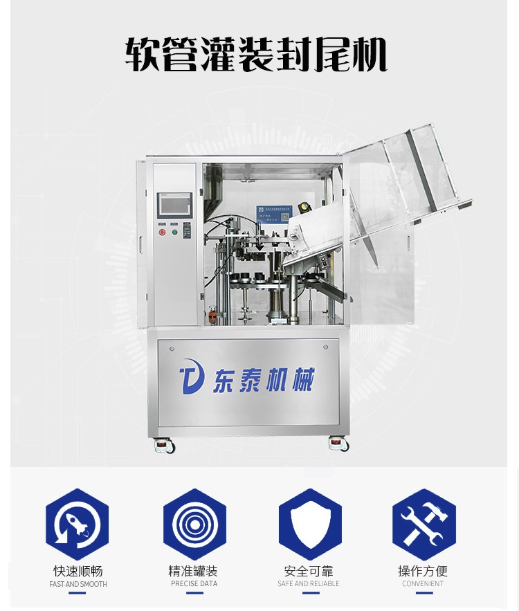 適用于醫(yī)藥、食品、化妝品、日用化工用品等行業(yè)的塑管、鋁塑復(fù)合管灌裝封尾需要?蓪⒏鞣N糊狀、膏狀、粘度流體等物料順利準(zhǔn)確地注入軟管中,并完成管內(nèi)熱風(fēng)加熱、封尾和打批號(hào)、生產(chǎn)日期等。