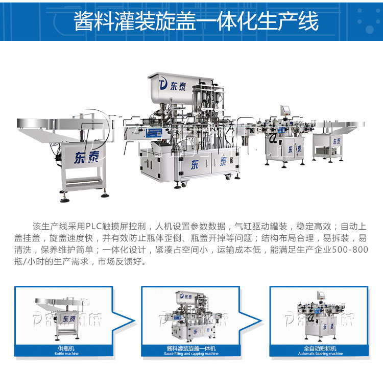 自動化醬料灌裝機是專業(yè)根據辣椒醬、豆瓣醬、牛肉醬、芝麻醬、香菇醬、蝦醬等醬類所研發(fā)設計的,市場上這么多的商品都是要經過包裝之后才能流通的,因此自動化醬料灌裝機成為了現(xiàn)代化社會生產的新技術,其經過我們東泰多年的科技成果不斷改進適用廣泛,在自動化方面等等更是十分的人性化,當前可以從各行業(yè)的產品生產來看都是可以選擇自動化醬料灌裝機來進行包裝的,該機依靠著我們東泰專業(yè)的技能占據著整個行業(yè)的重位,從而更好的滿足人們的消費觀念
